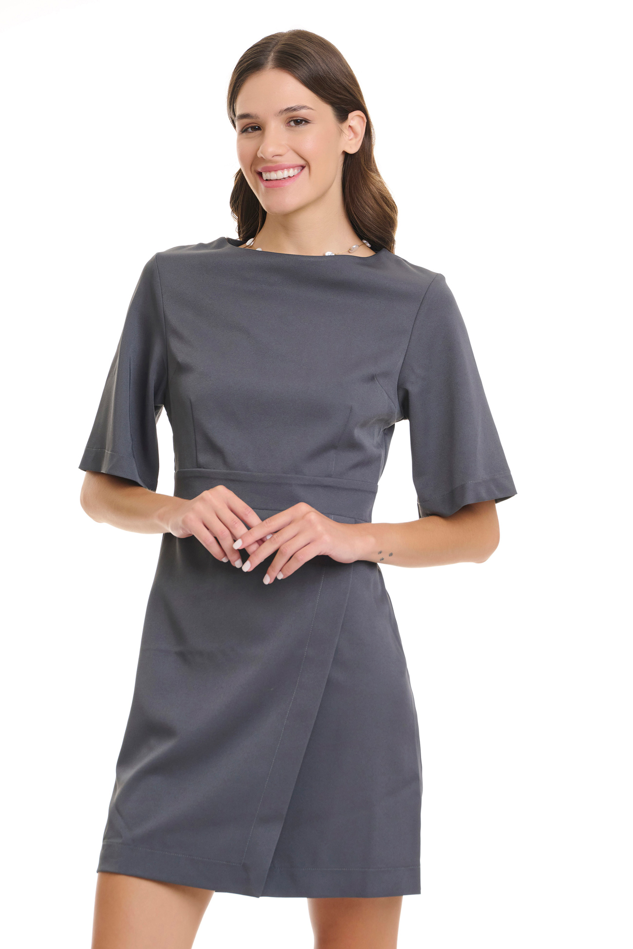 Tailored professional dress designed to deliver elegance and ease of movement during long working hours.